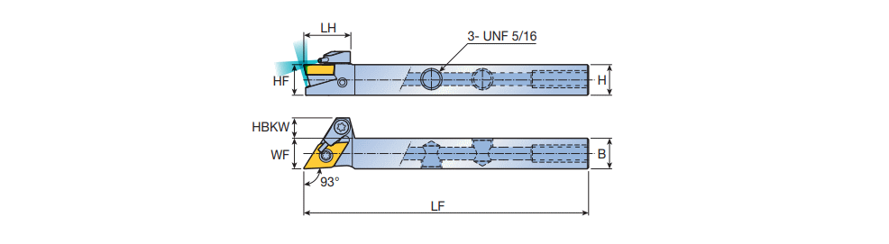 Screw type high pressure coolant holders with 93° approach angle & 55° DC.T positive inserts for Swiss type automatic lathes