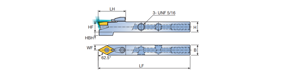 Screw type high pressure coolant holders with 62.5° approach angle & 55° DC.T positive inserts for Swiss type automatic lathes