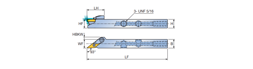 Screw type high pressure coolant holders with 93° approach angle & 35° VB.T positive inserts for Swiss type automatic lathes