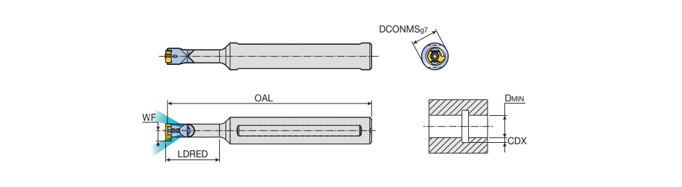 Solid carbide boring bars with coolant holes for internal shallow grooving on small diameter Dmin=10mm with TMIS 8 inserts