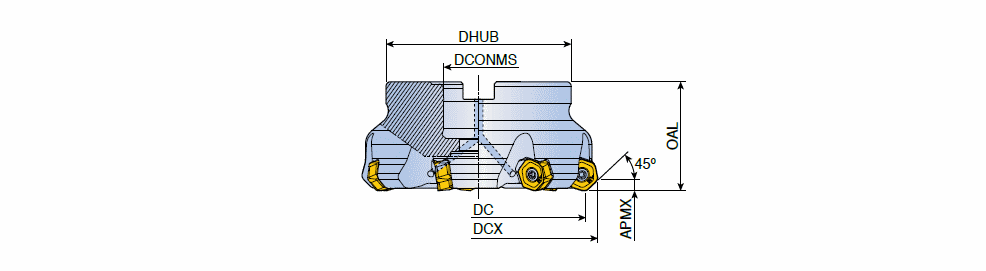 45° Face mills with reinforced 12 cutting edges inserts of high positive angle for general milling in max. depth of cut ap 3.0 mm
