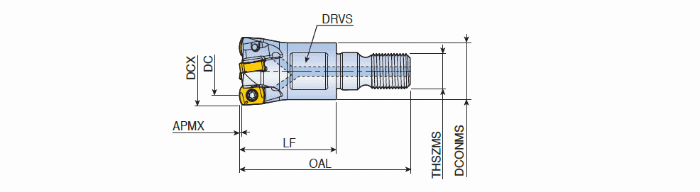 High feed end mills with BLMP 04 inserts of 4 cutting edges and T-FLEXTEC modular adaptations in maximum depth of cut ap 0.5 mm