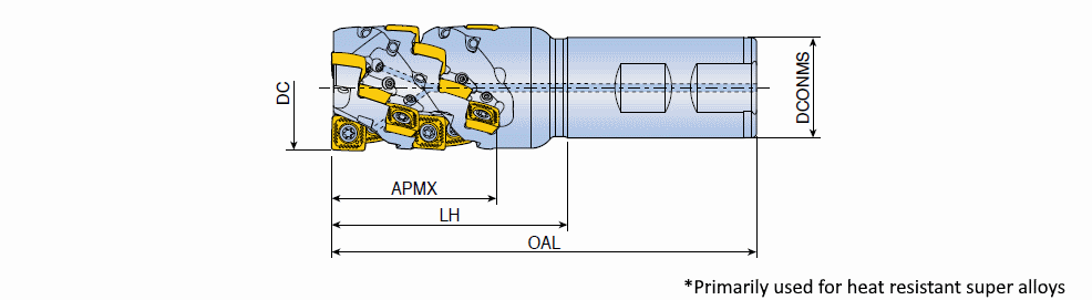 Extended flute end mills for exotic material machining with unique rigid V-bottom positive square SVK(H)T inserts of four convex cutting edges without mismatch