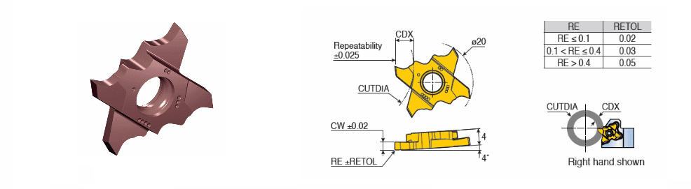 The Kit for mass production contains 1 toolholder and TQS 20Quadrush small size inserts for grooving in swiss turn