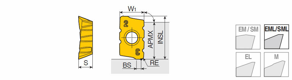 Positive chip splitter inserts of APKT 17 with two helical cutting edges & high positive rake for 90° shoulders and 3 splitting grooves on one side & 2 splitting grooves on the opposite