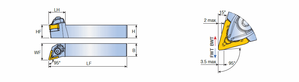 T-holders with TNMV 6 corner negative inserts for multi directional turning and high feed backward turning