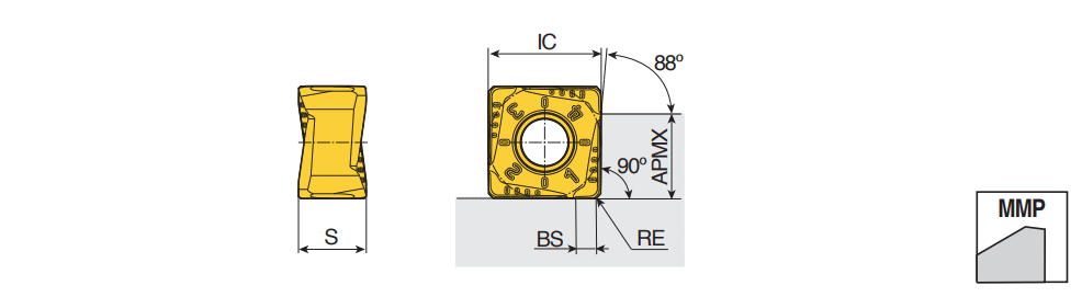 Double-sided Square inserts with economical 8 cutting edges for 90° shouldering and face milling in general applications