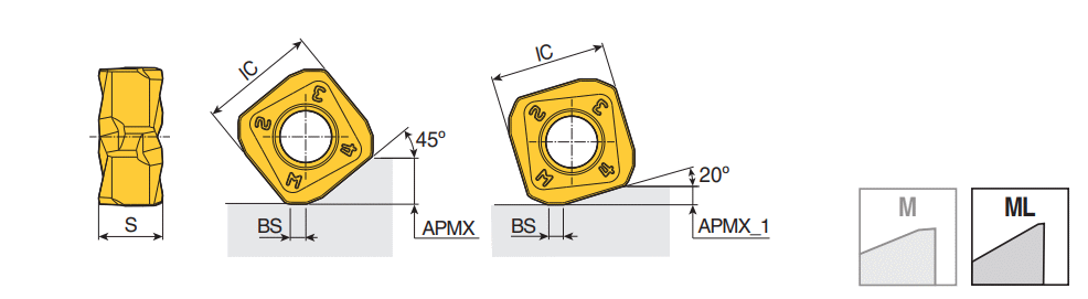 Double-sided Square inserts with 8 cutting edges for roughing (45°) and high feed (20°) face milling and high feed machining.