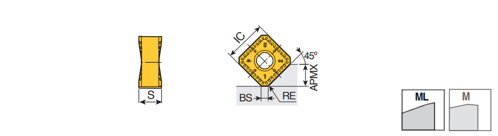 Double-sided square inserts with 8 cutting edges for 45 face mills and general applications from roughing to finishing