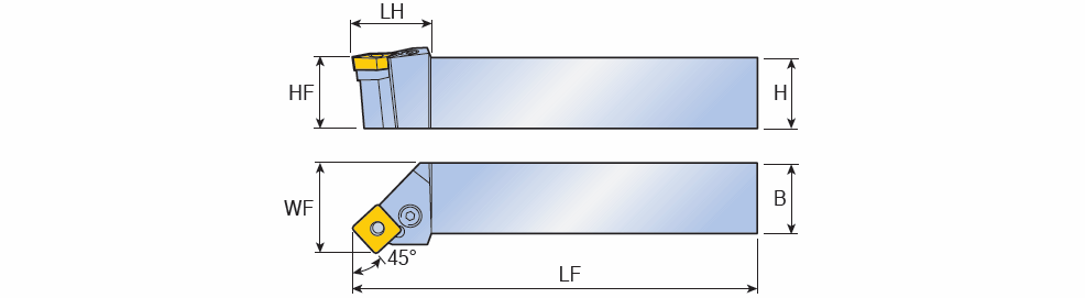 Lever type holders with 45° approach angle & negative Square inserts for longitudinal & face turning