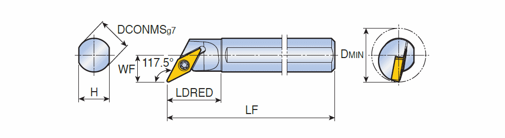TOPMINI screw type boring bars with positive 35° Rhombic inserts of 7° clearance angle and 117.5° approach angle for small components machining