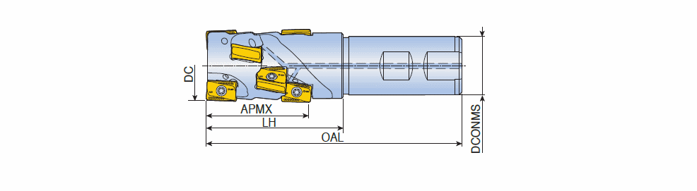 Extended flute end mills with 4 helical cutting edges of double-sided AN 16 inserts