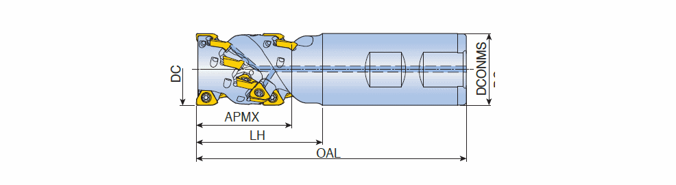 Extended flute end mills with 3PKT 10 inserts of positive 3 helical cutting edges