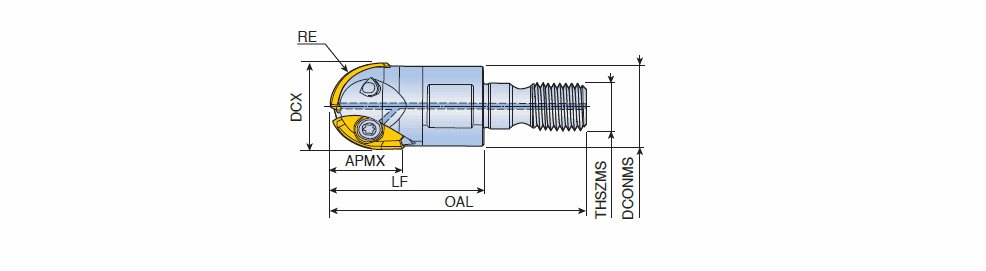 Ball nose end mills for rough or semi-finish profiling with T-FLEXTEC modular adaptation with one insert of both internal and external pockets in diameters of 16/20/25/30/32 mm