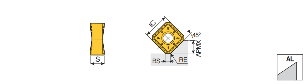 Double-sided ground square inserts with polished top and 8 economical sharp cutting edges for aluminum machining in 45° face mills