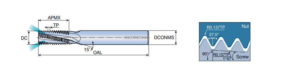 Solid carbide threading endmills with coolant holes located in the flutes, used for internal or external BSPT thread profile.
