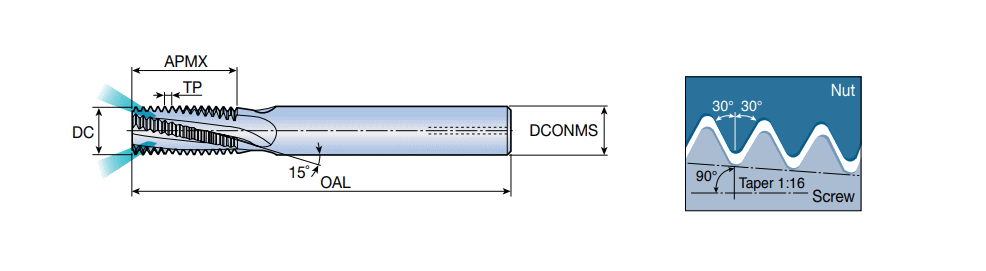 Solid carbide threading endmills with coolant holes located in the flutes, used for internal or external NPT thread profile.