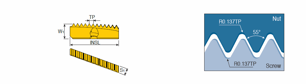 External & internal Whitworth (BSW, BSF, BSP) full profile thread milling inserts, for fittings and pipe couplings.