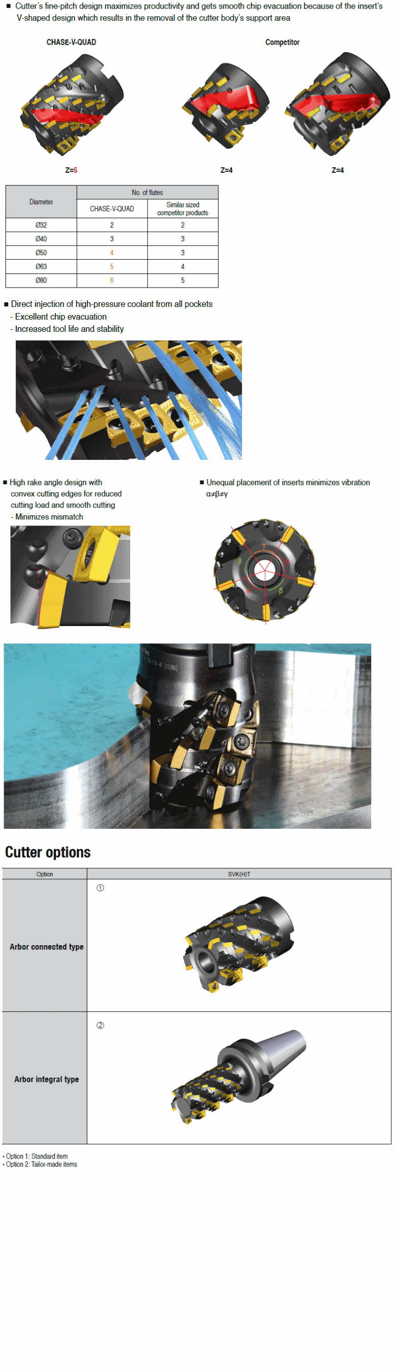 : Extended flute end mills for exotic material machining with unique rigid V-bottom positive square SVK(H)T inserts of four convex cutting edges without mismatch