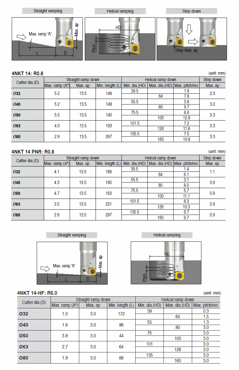 : 90° Modular end mills with T-FLEXTEC adaptation & unique four high positive helical cutting edges of double-sided 4NKT 14 inserts & high ramping capability