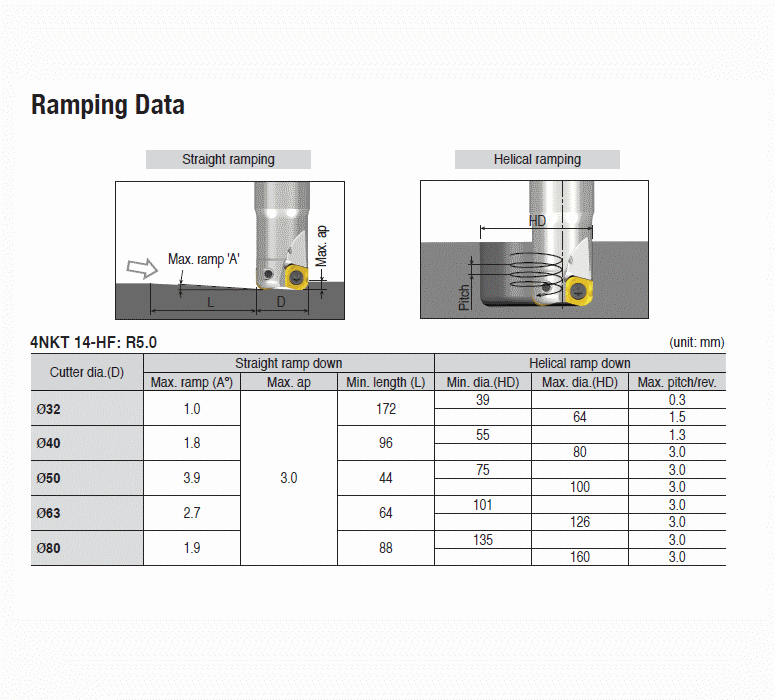 : Double-sided inserts with four high positive helical cutting edges for High feed milling in max. depth of cut ap 3.0 mm