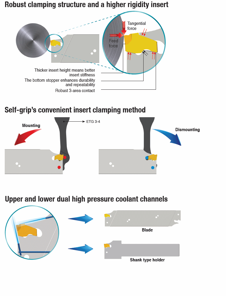 : Rigid single-ended inserts with strong cutting edge for medium to high feed parting & deep grooving of steel & stainless steel