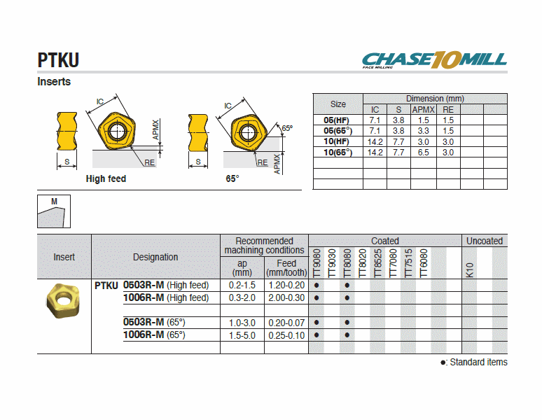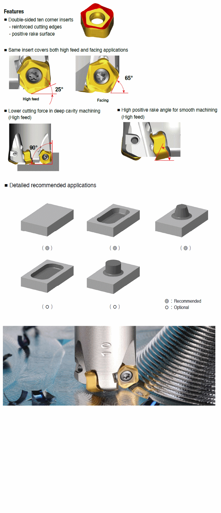 : High positive double-sided inserts with economical 10 cutting edges for 65° Face mills and High Feed mills