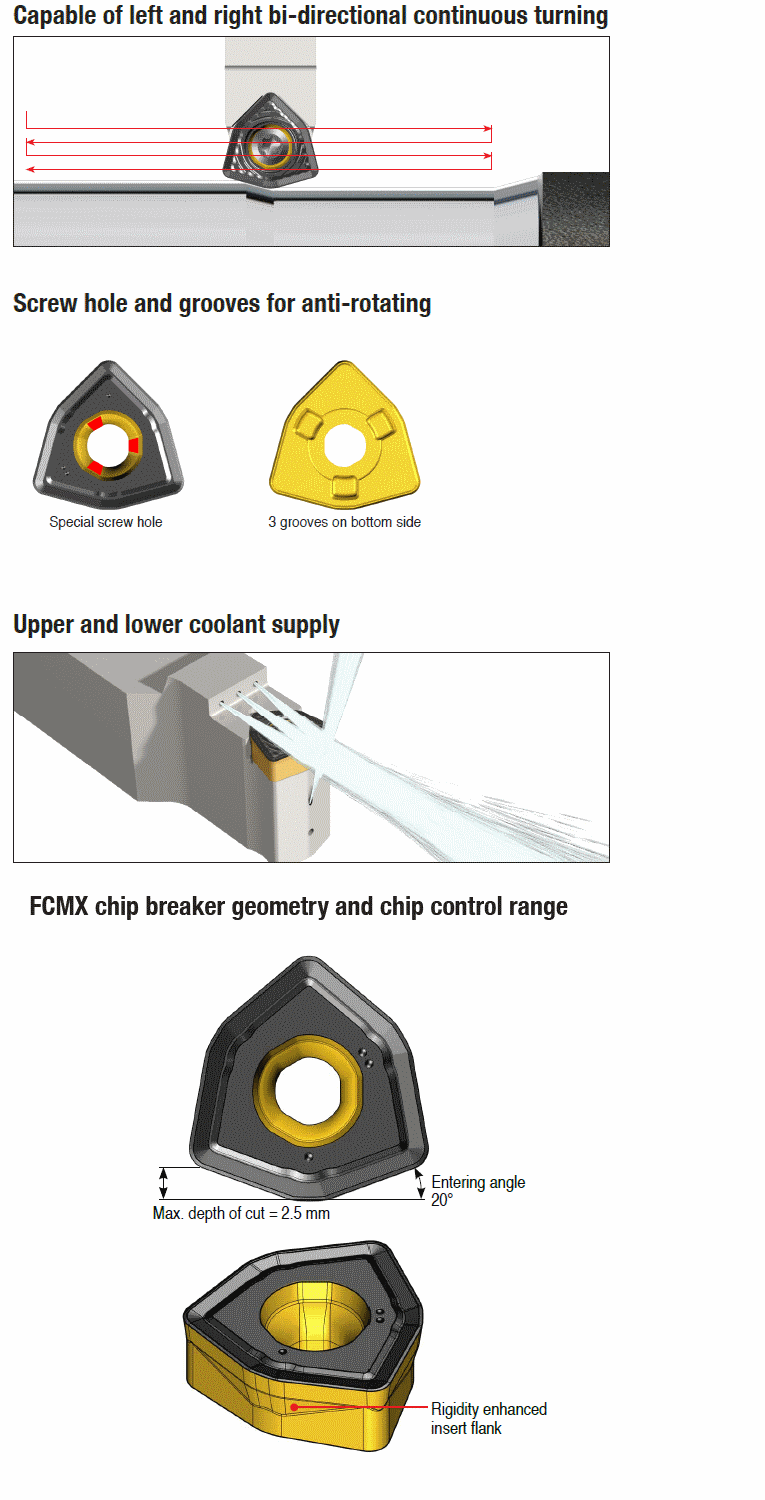 : Screw type holders with FCMX trigonal positive inserts & internal coolant for bi-directional high feed turning