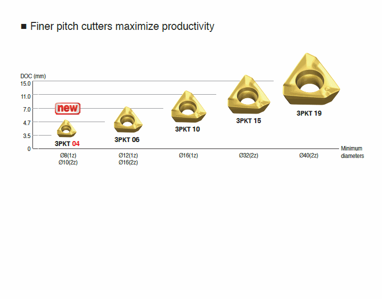 : High positive inserts 3PK(H)T with 3 helical cutting edges for 90° shoulders & exotic materials & light machining from sharp geometry
