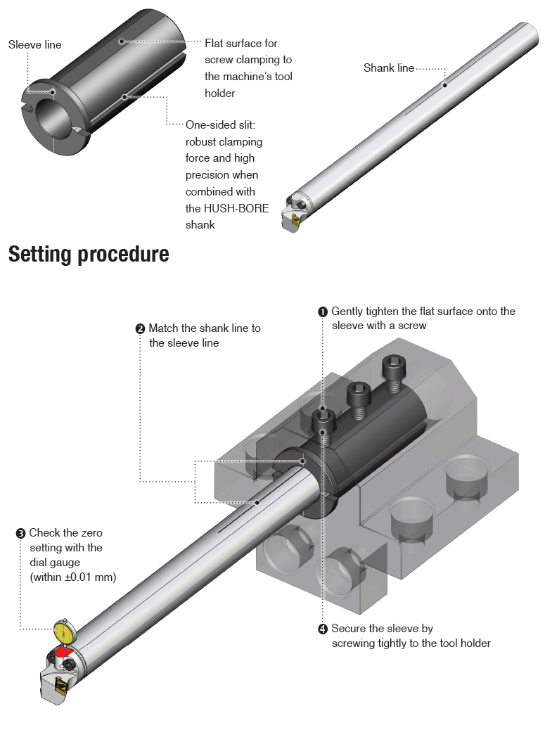 : HUSH-BORE Sleeves for deep boring machining up to 10 times with anti-vibration damping round shank