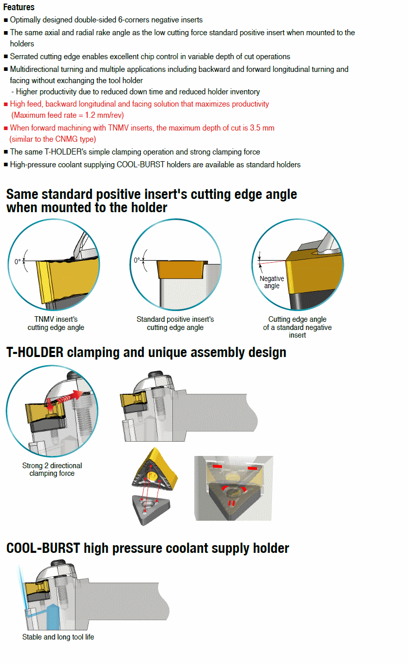 : T-holders for high pressure coolant with 95° approach angle and TNMV 6 corner negative triangular inserts