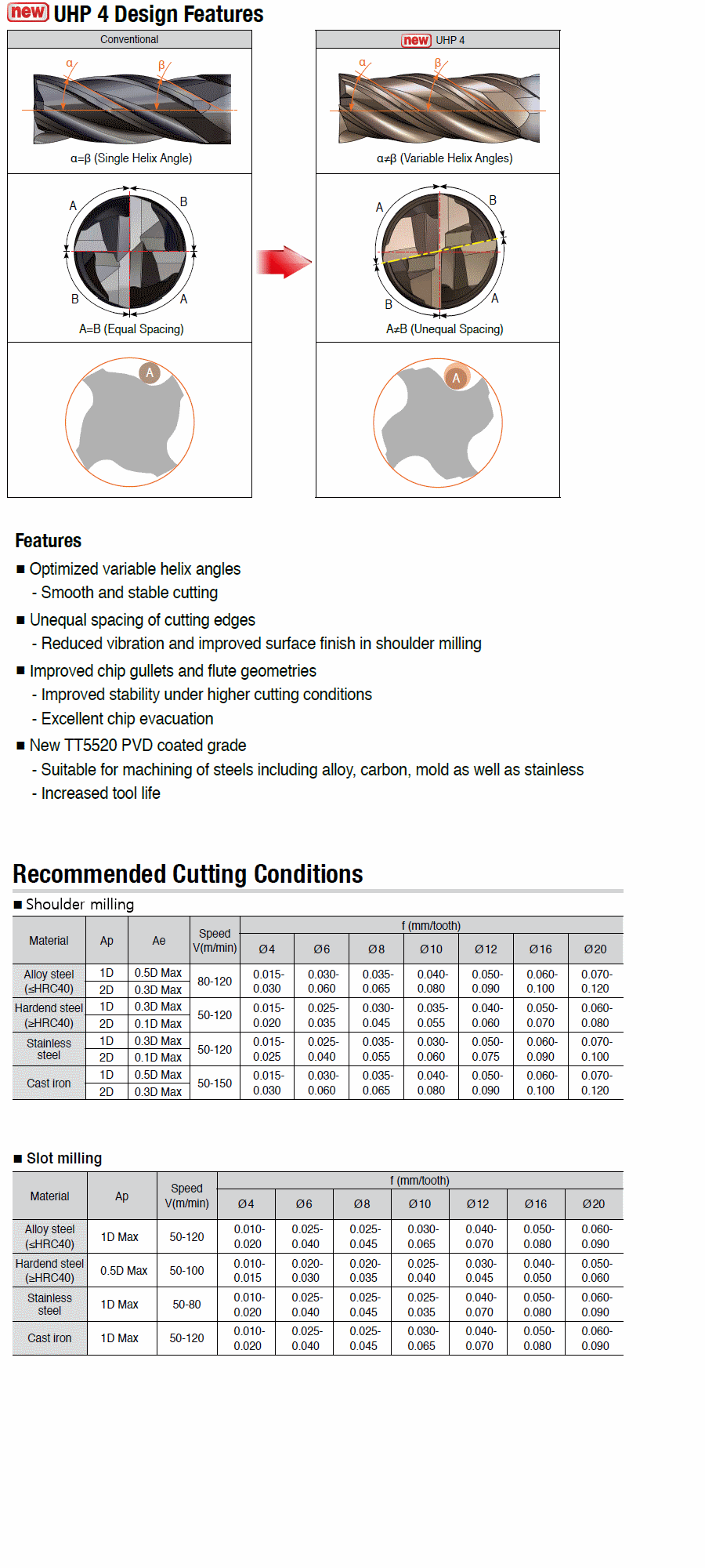 : 4 flute, corner R type solid carbide end mills with different helix and unequal spacing for machining of steels including alloy,carbon, mold as well as stainless