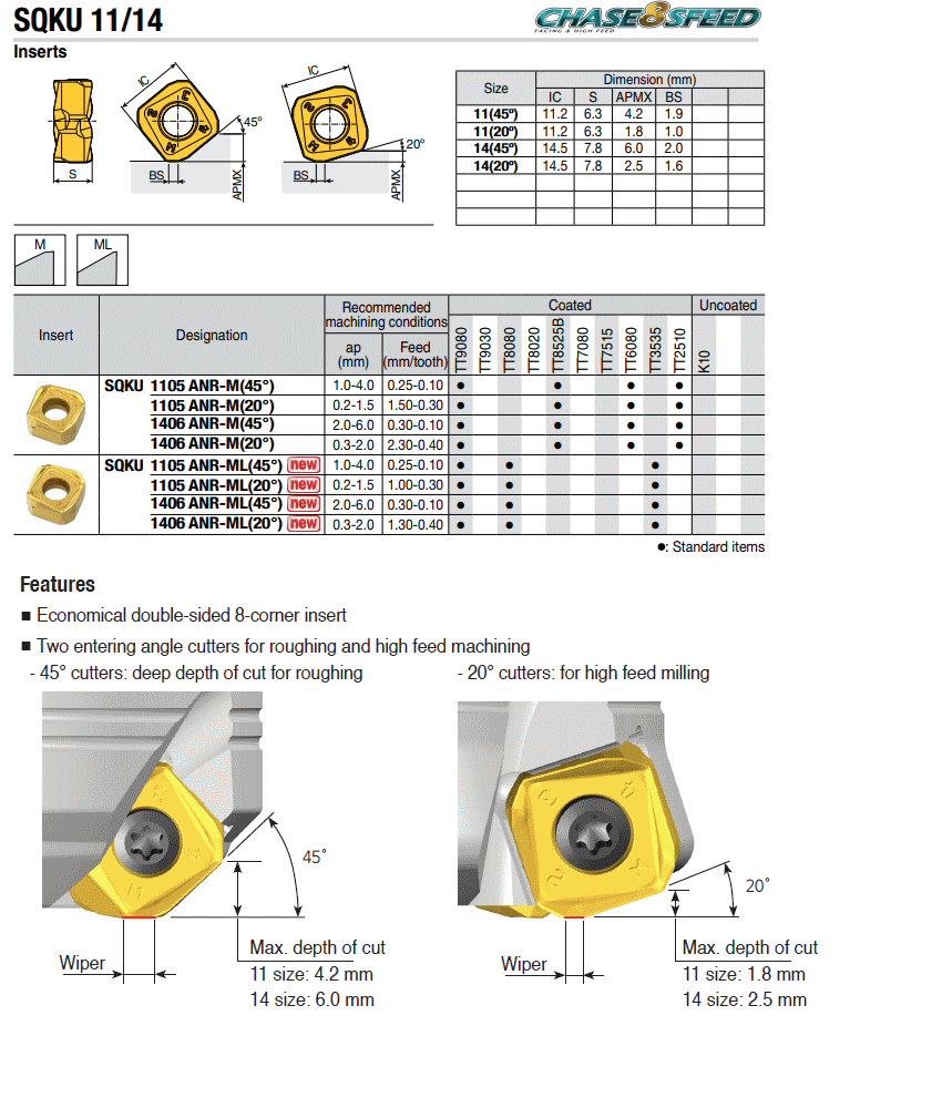 : Double-sided Square inserts with 8 cutting edges for roughing (45°) and high feed (20°) face milling and high feed machining.
