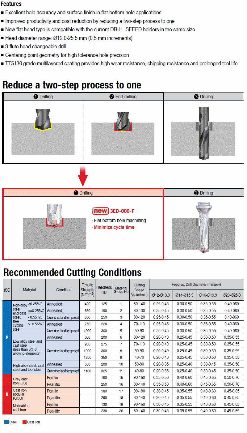 : Exchangeable 3 flute drill heads for flat bottom hole machining with high productivity in steel and cast iron.